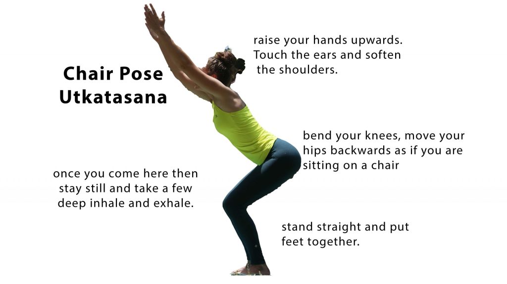 Chair pose or UTKATASANA exercises the spine, hips, and chest muscles. It helps strengthen the lower back and torso. Tones the thigh, ankle, leg, and knee muscles. Balances the body and brings determination to the mind.